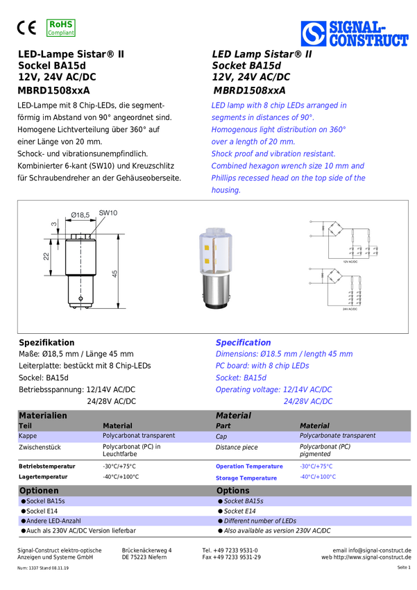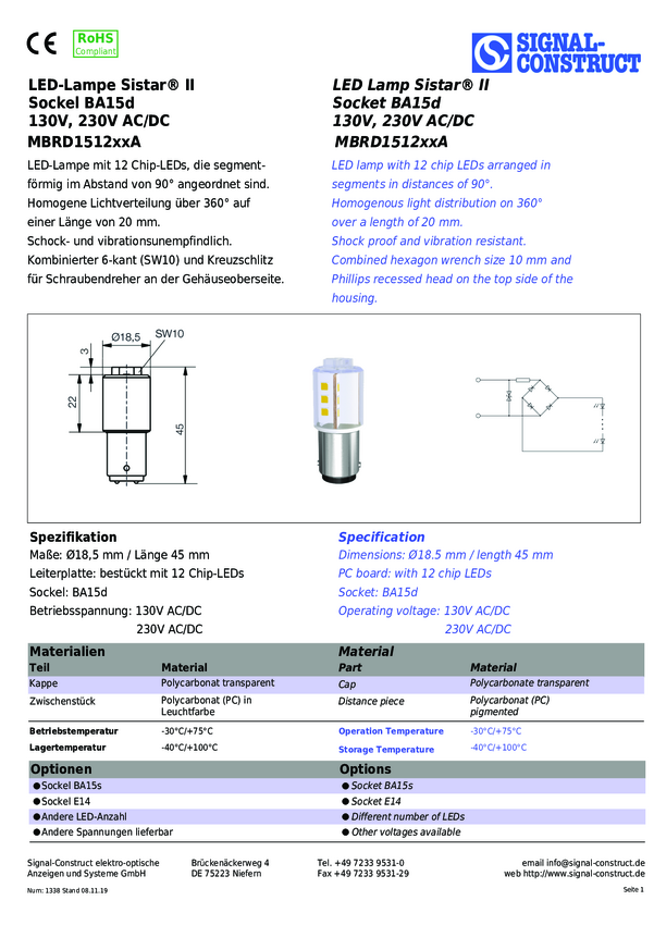Signal Construct MBRD151208A Lampa LED czerwony BA15D 230 V DC/AC