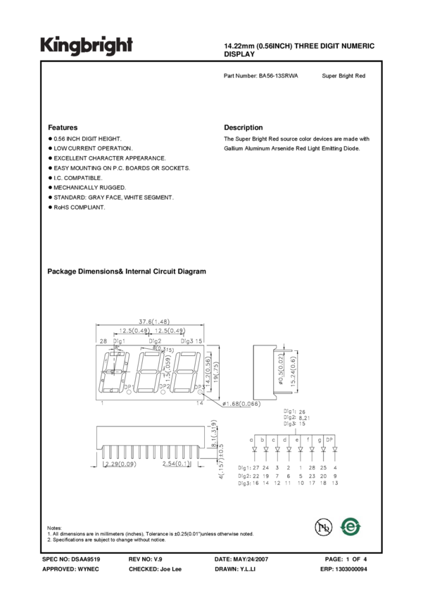 Wyświetlacz 7 segmentowy Kingbright BA56-12EWA czerwony