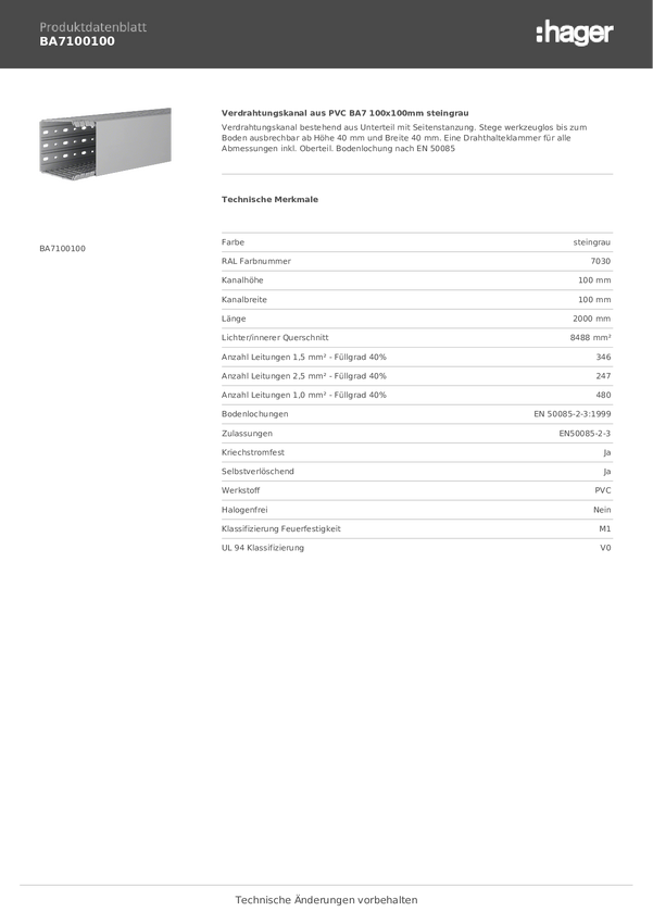 Kanał na wiązki Hager BA7100100 BA7100100 (D x S x W) 2 m x 100 mm x 100 mm 2 m