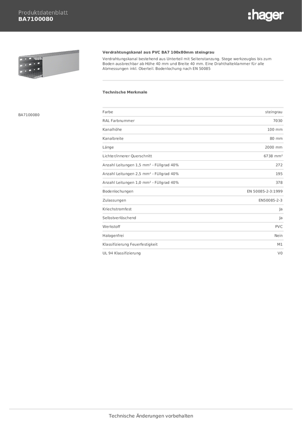 Kanał na wiązki Hager BA7100080 BA7100080 (D x S x W) 2 m x 80 mm x 100 mm 2 m