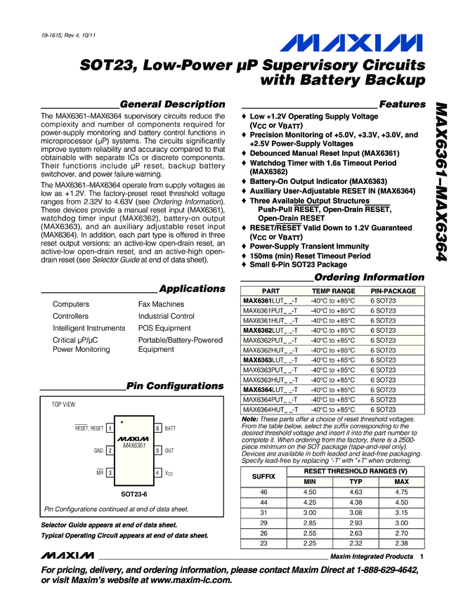 MAX6361, MAX6362, MAX6363, MAX6364 SOT23, Low-Power Microprocessor Supervisory Circuits with Battery Backup
