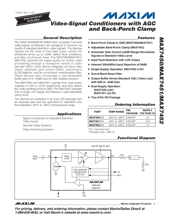 MAX7450, MAX7451, MAX7452 Video-Signal Conditioners with AGC and Back-Porch Clamp