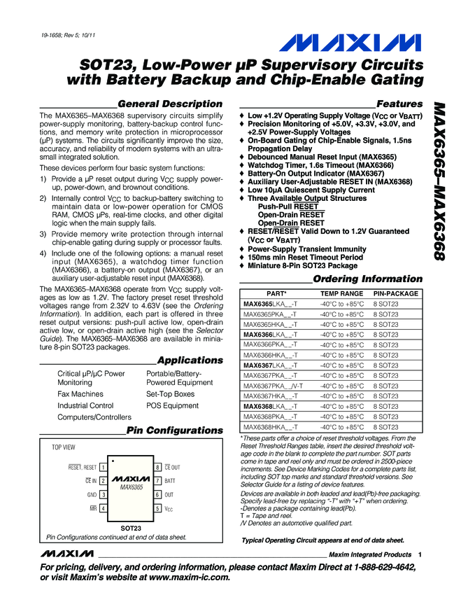 MAX6365, MAX6366, MAX6367, MAX6368 SOT23, Low-Power µP Supervisory Circuits with Battery Backup and Chip-Enable Gating