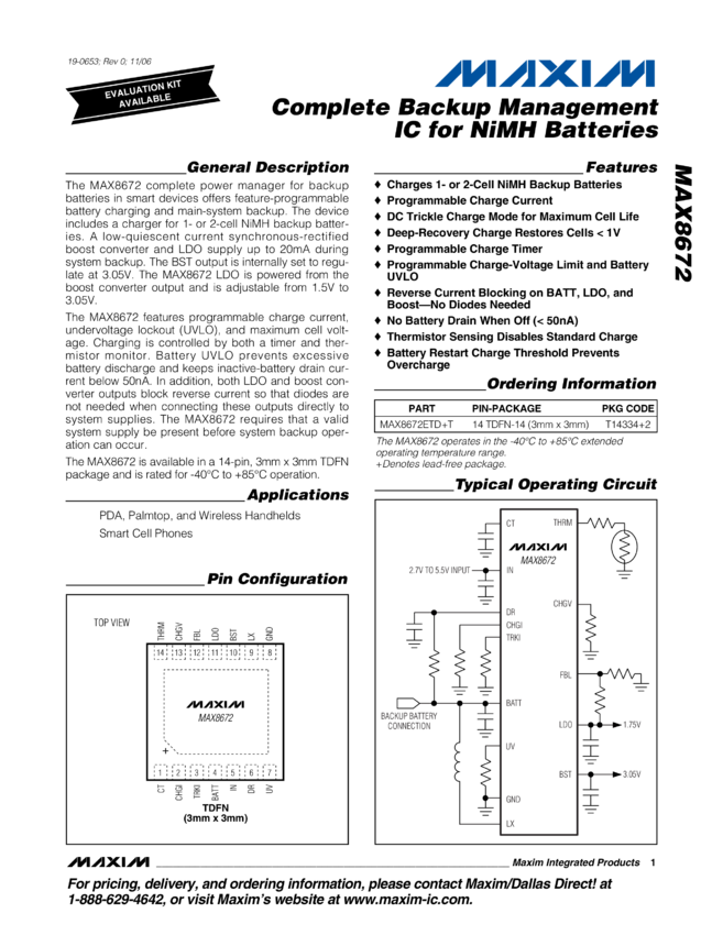 MAX8672 Complete Backup Management IC for NiMH Batteries