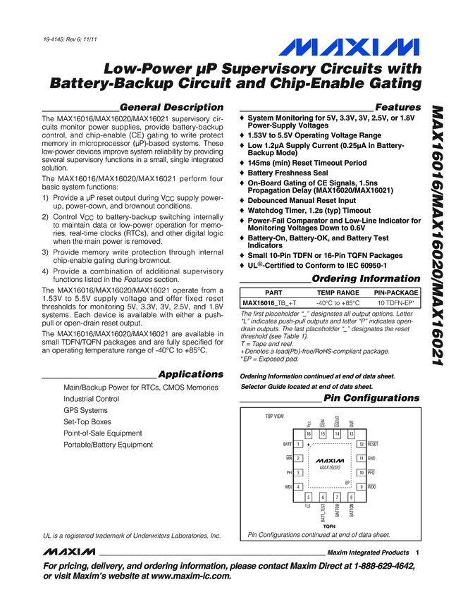 MAX16016, MAX16020, MAX16021 Low-Power μP Supervisory Circuits with Battery-Backup Circuit and Chip-Enable Gating