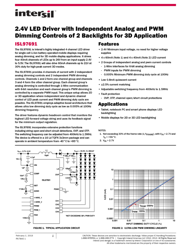 2.4V LED Driver with Independent Analog and PWM Dimming Controls of 2 Backlights for 3D Application