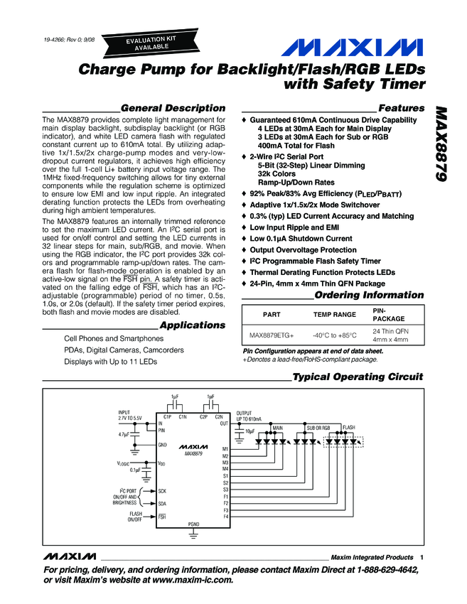 MAX8879 Charge Pump for Backlight/Flash/RGB LEDs with Safety Timer