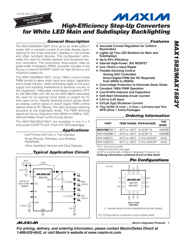 MAX1582 High-Efficiency Step-Up Converters for White LED Main and Subdisplay Backlighting