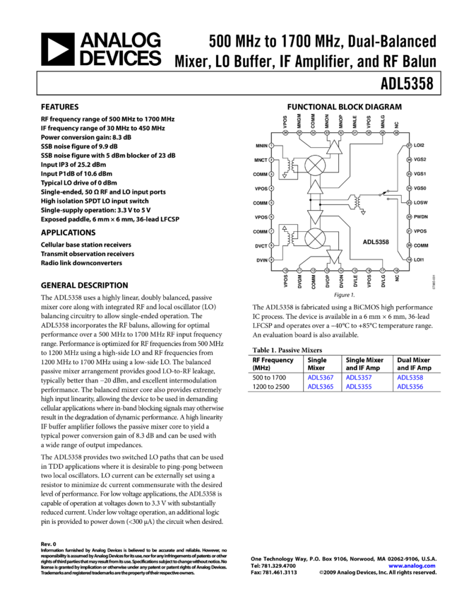 ADL5358: 500 , Dual-Balanced Mixer, LO Buffer, IF Amplifier, and RF Balun