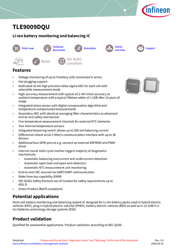 Li-Ion battery monitoring and balancing IC The TLE9009DQU is a multi-channel battery monitoring and balancing IC crafted for Li-Ion battery packs in automotive (MHEV, HEV, PHEV, BEV), industrial (ESS), and consumer applications (e-bike BMS, home energy storage). It handles cell voltage and temperature measurement, cell balancing, and isolated communication to the main battery controller. Moreover, it includes essential diagnostic tools for safety assurance.