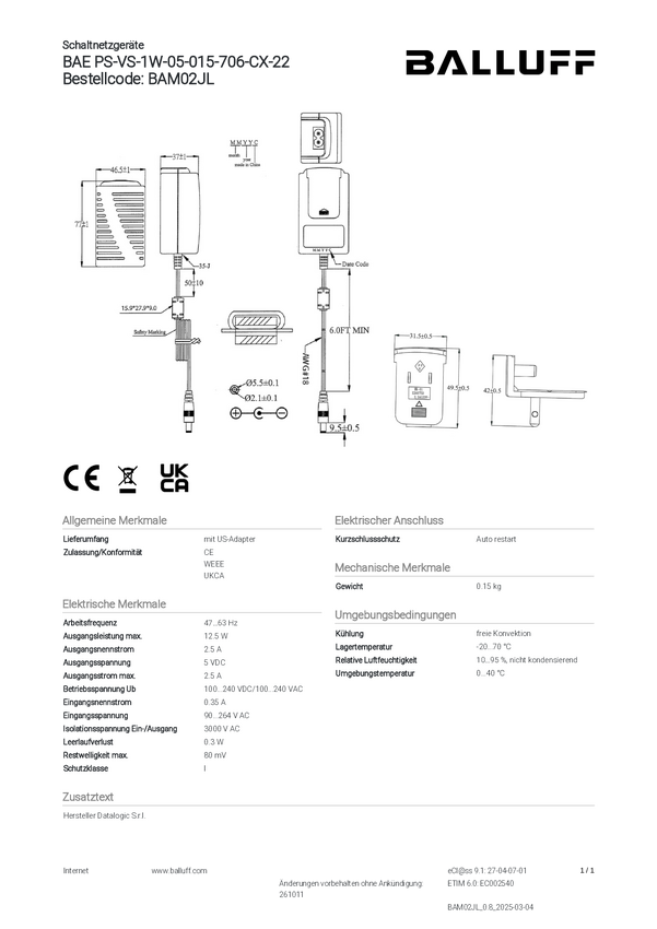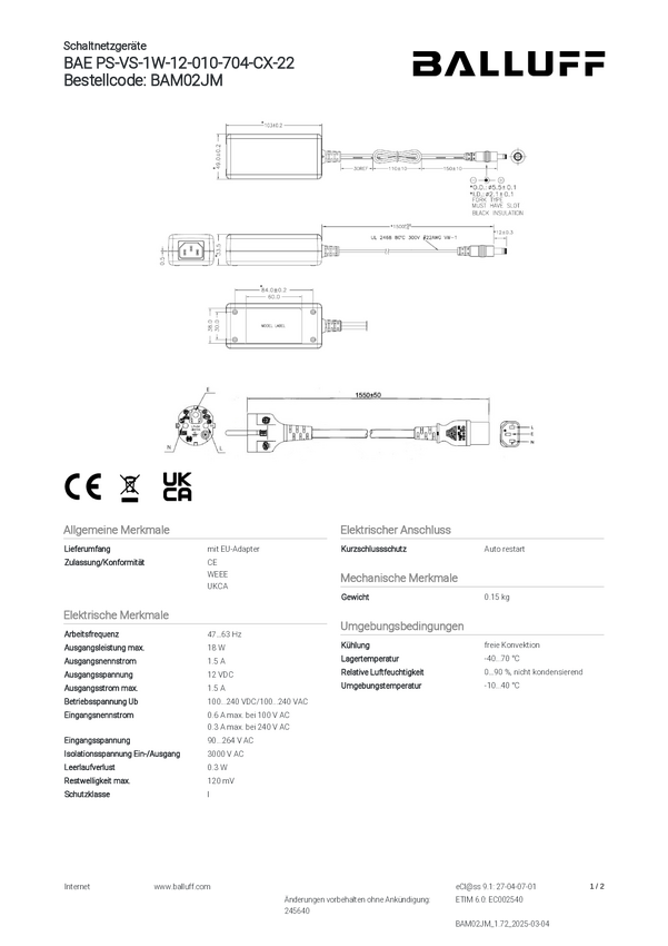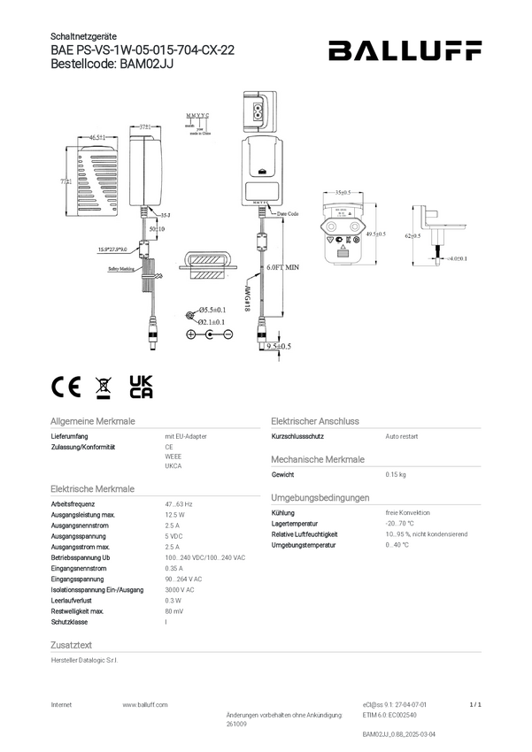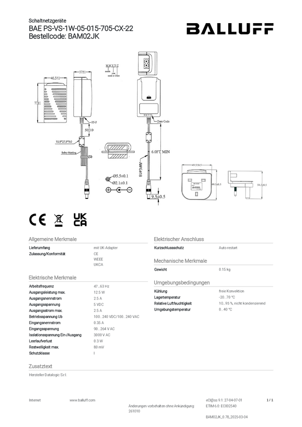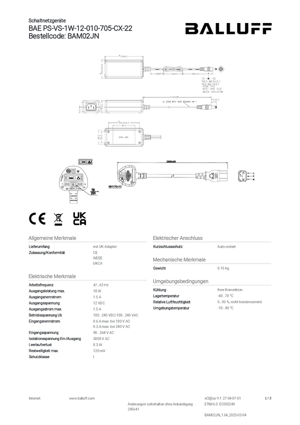Jednostka zasilająca BALLUFF BAE PS-VS-1W-05-015-705-CX-22