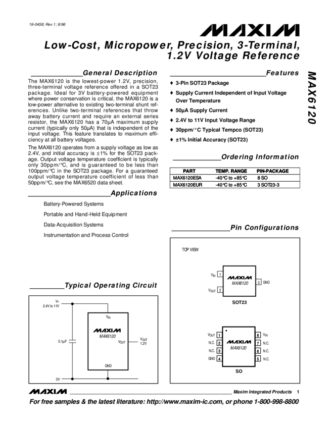 MAX6120 Low-Cost, Micropower, Precision Bandgap, 1.2V Series Voltage Reference