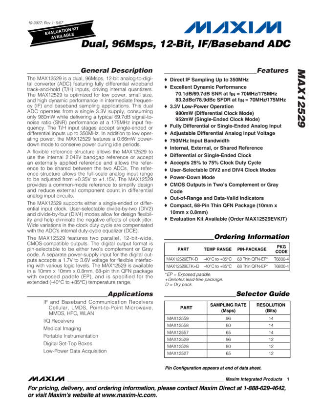 MAX12529 Dual, 96Msps, 12-Bit, IF/Baseband ADC