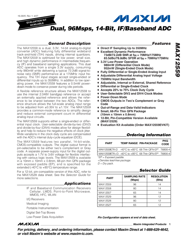 MAX12559 Dual, 96Msps, 14-Bit, IF/Baseband ADC