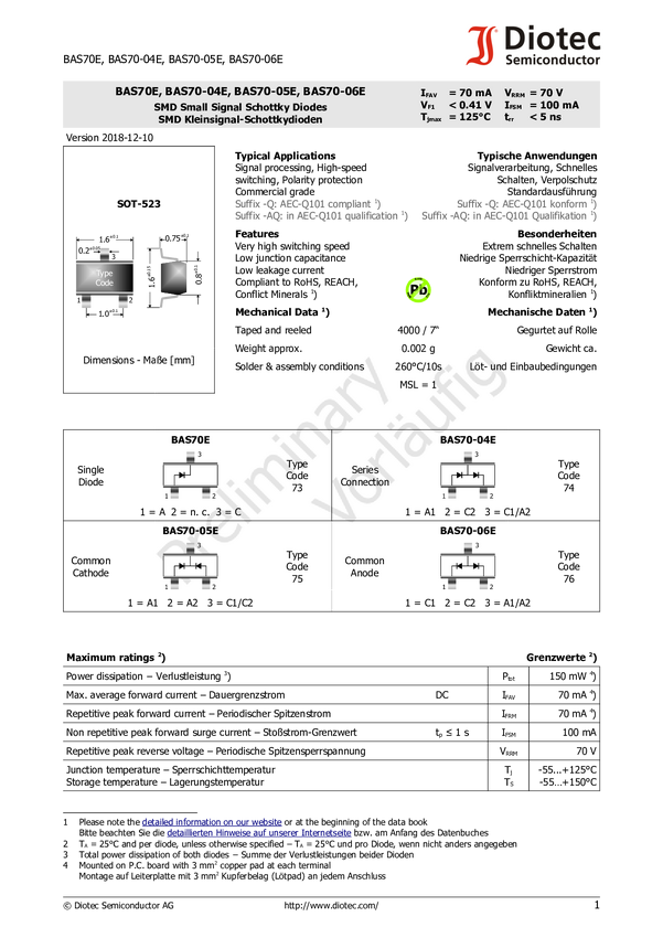 Schottky'ego, SOT-523, 70V, 0,07A Diotec BAS70-05E N/A N/A N/A