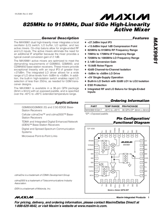 MAX9981 825MHz to 915MHz, Dual SiGe High-Linearity Active Mixer for Basestations
