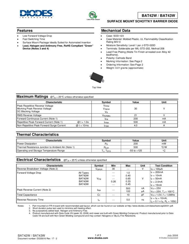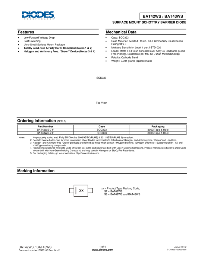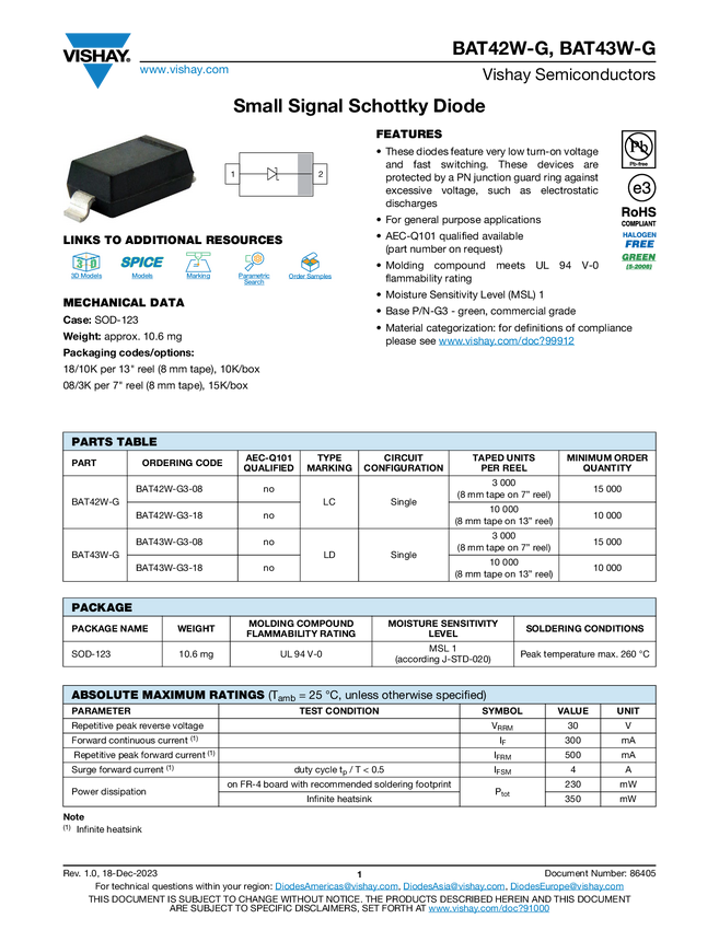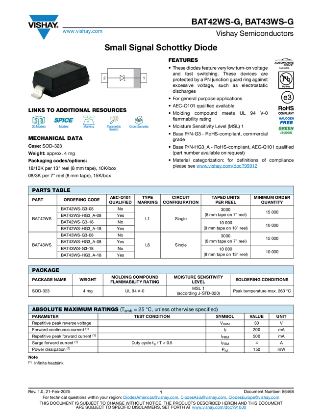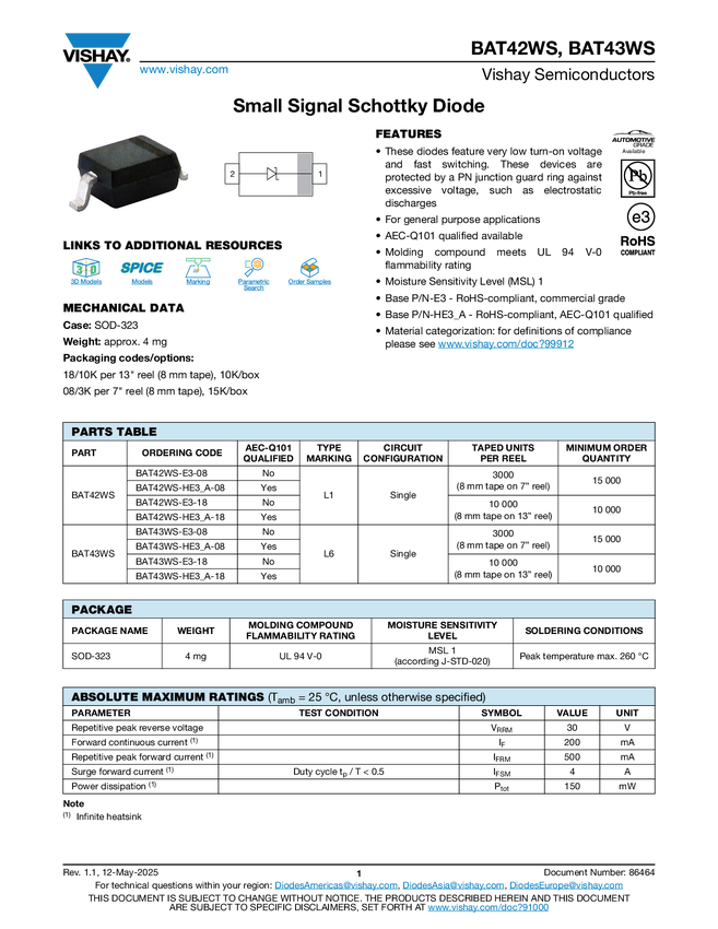 Dioda Schottky'ego Taiwan Semiconductor BAT43WS RRG N/A N/A N/A U(RRM) 30 V