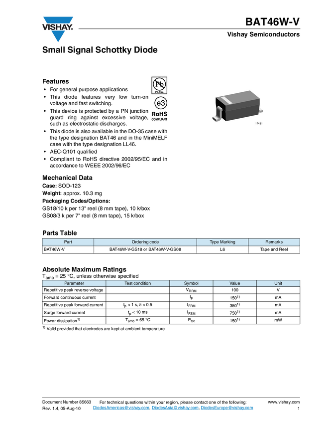 Dioda prostownicza Schottky'ego Vishay BAT46W-E3-08 N/A N/A N/A