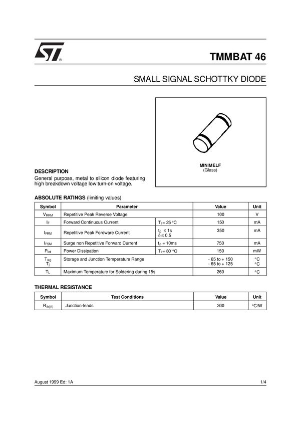 Dioda prostownicza Schottky'ego BAT46 STMicroelectronics BAT46FILM Rodzaj obudowy MiniMELF GLASS N/A N/A N/A