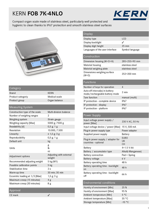 Kern FOB7K4NLO Waga do organów Zakres pomiaru maks. 7500 g bateryjne