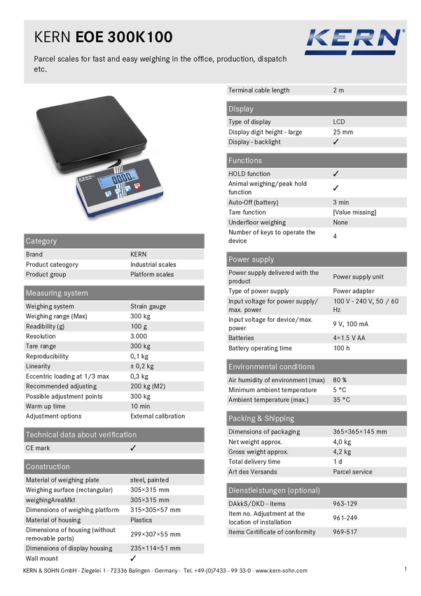 Kern EOE 300K100 Waga platformowa Zakres pomiaru maks. 300 kg Podziałka 100 g z sieci elektrycznej, bateryjne
