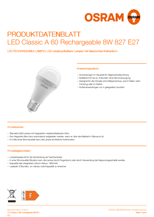 Żarówka Źródło światła LED zasilane bateryjnie OSRAM HOMELIGHTING 4099854190131 E-27 8 W = 60 W biały 1 szt.