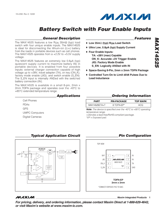 MAX14525 Battery Switch with Four Enables