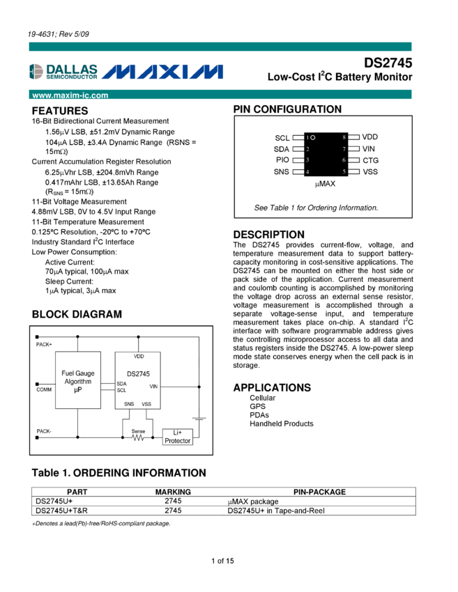 DS2745 Low-Cost I²C Battery Monitor
