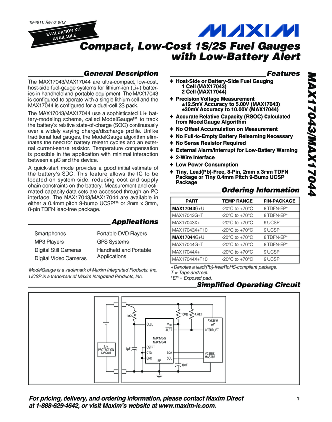 MAX17043, MAX17044 Compact, Low-Cost 1S/2S Fuel Gauges with Low-Battery Alert