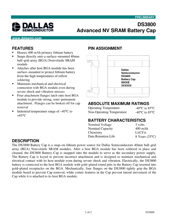 DS3800 Advanced NV SRAM Battery Cap
