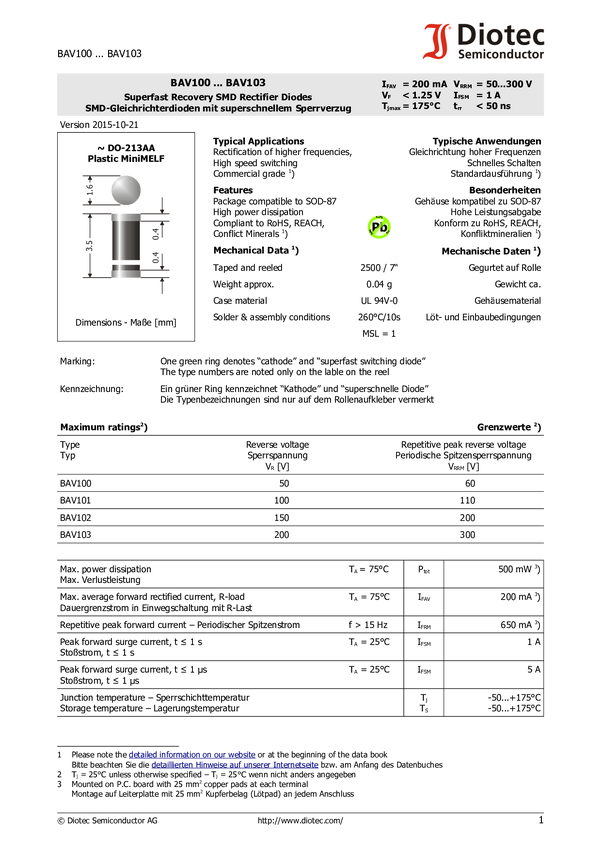 Dioda prostownicza Diotec BAV102 N/A N/A