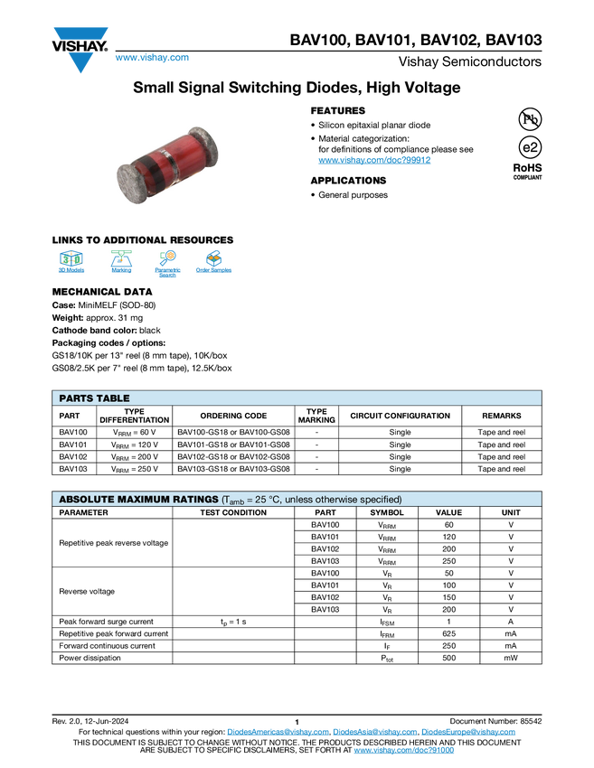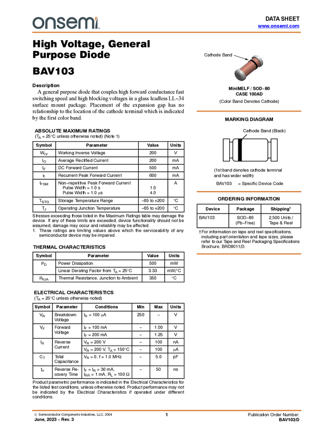 Dioda - Minimelf, SOD80C, LL-34; LLDS 200V, 250mA DC, 50nS, Fast recovery < 500 ns - 200mA 1pF; 1 Mhz standardowe opakowanie 2500 sztuk
