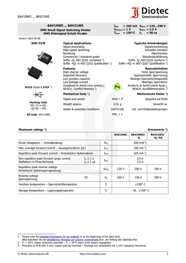 Dioda małego sygnału Diotec BAV21WS-AQ N/A N/A