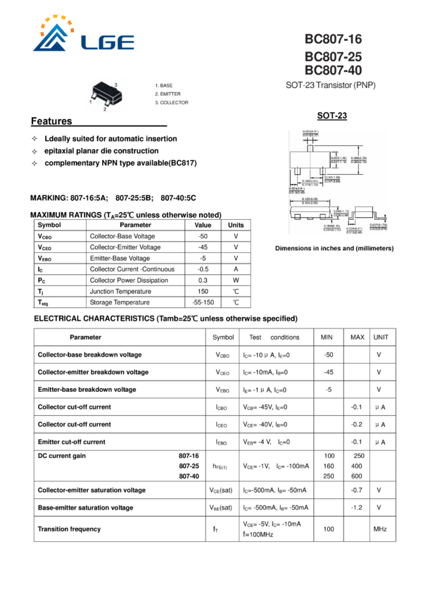 Tranzystor PNP, 0.5A, 45V, SOT23 LGE, ARK