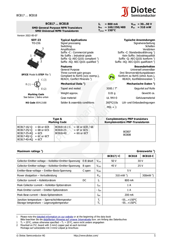 Diotec BC817-40-AQ Tranzystor (BJT) - dykretny 1 szt.