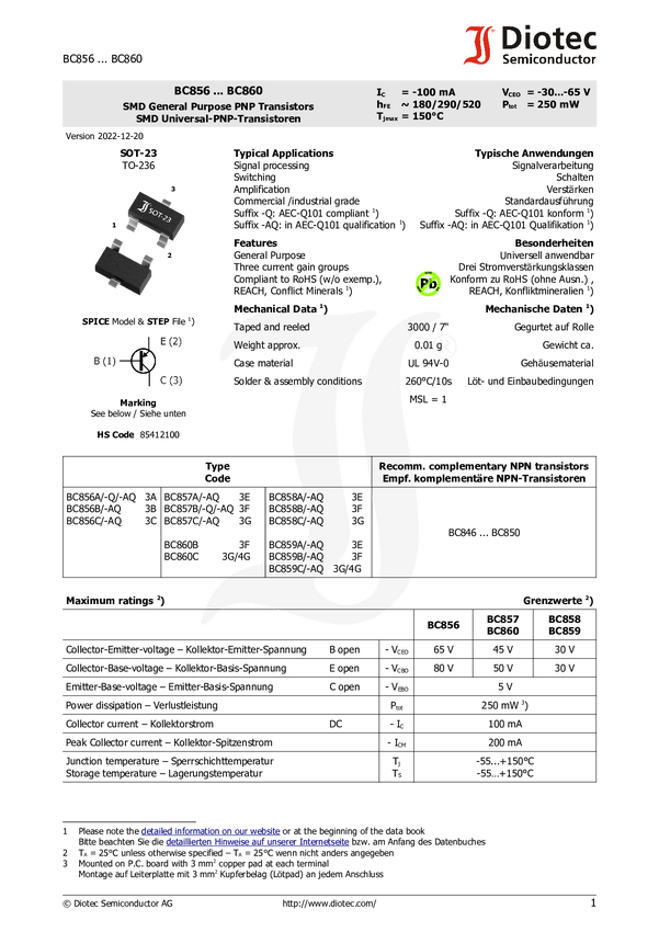 Diotec BC856A-AQ Tranzystor (BJT) - dykretny 1 szt.