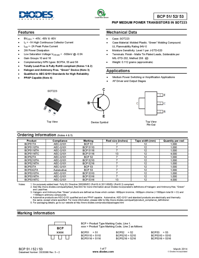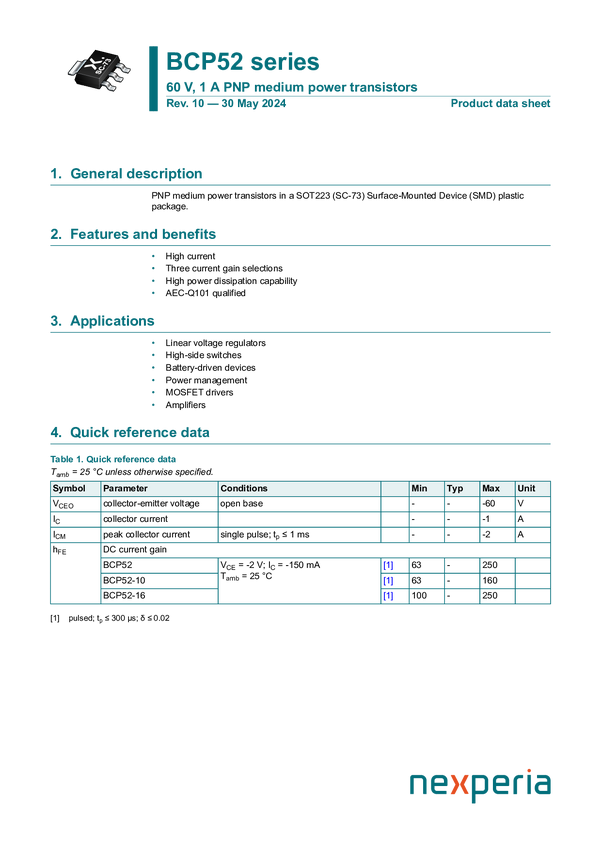 Tranzystor; BCP52-16; PNP; 1A; 60V; 1,6W; bipolarny; SOT223; SMD; NEXPERIA; RoHS