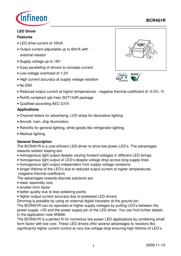 LED driver BCR401R, 10mA, 18V SOT143R, Infineon