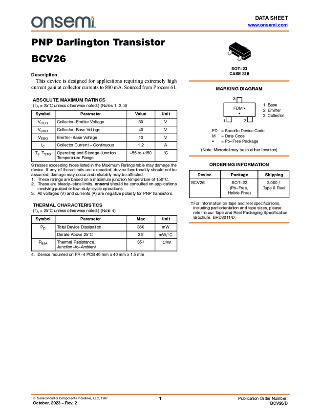 Tranzystor Darlingtona Infineon BCV 26, PNP, SOT 23, I(C) 0.5 A, U(CEO) 30 V, I(CM) 500