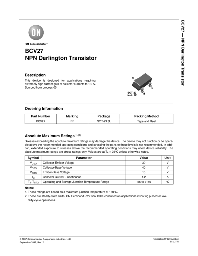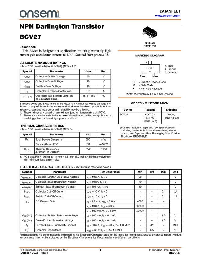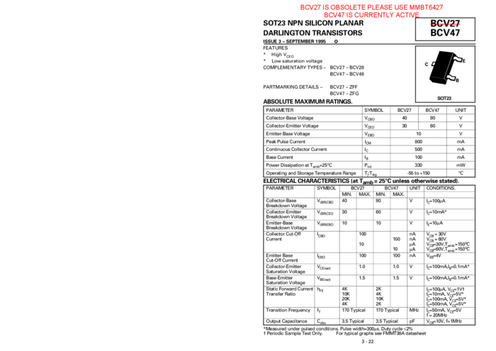 Tranzystor Infineon BCV 27, NPN, SOT 23, I(C) 0.5 A, U(CEO) 30 V, I(CM) 800 mA