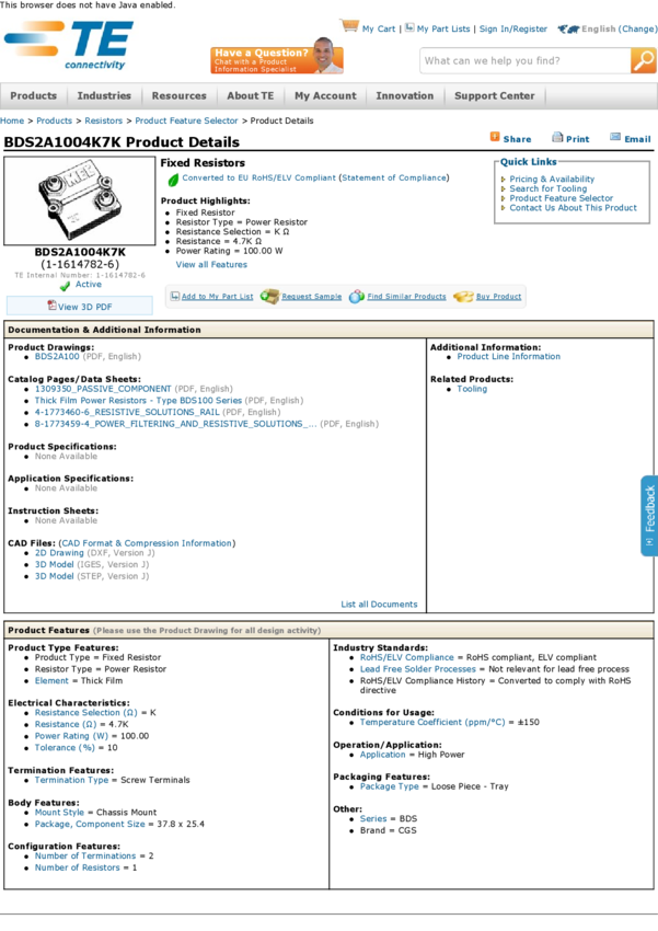 Res Thick Film 4.7K Ohm 10% 100W ±150ppm/°C Screw Terminal Bolt-On