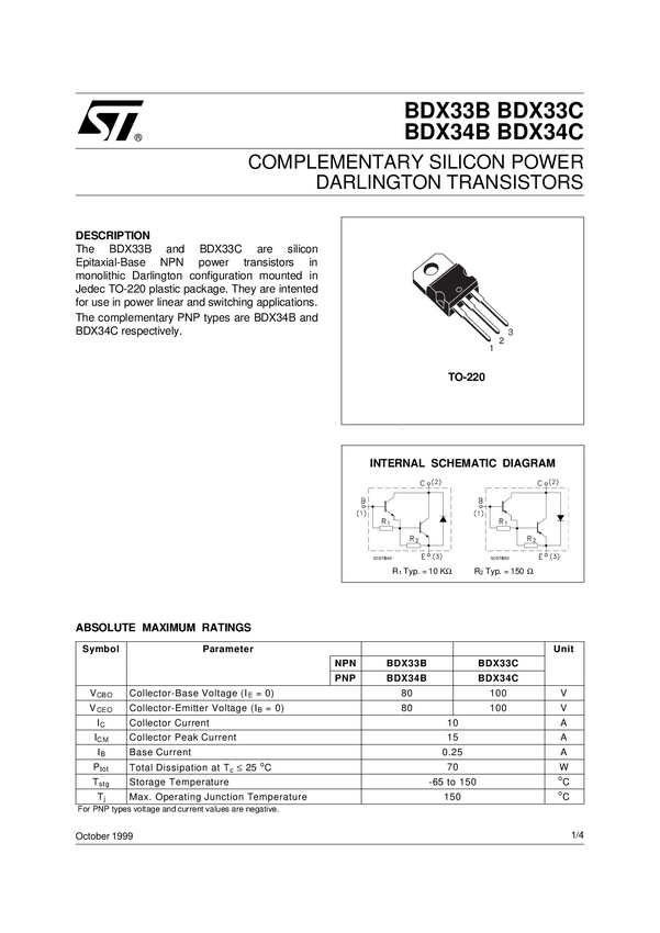 Tranzystor; BDX33C; NPN; 10A; 100V; 70W; Darlington; bipolarny; TO220; THT; STMicroelectronics; RoHS