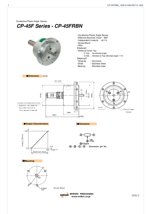 Potencjometr przew.plastyk Servo IP55 śr.koł. 66mm; śr.całk. 87mm; gł.50mm; gł.ze złączem herm. 118mm; oś. 6mm dł. 15mm; kąt.el.350 st; kąt mech 360 st 3W/ 70 st.; -40+120 st; trwałość 5 M cykli Rez. 5 kohm lin 0,3% CPP-45RBN has been changed new model CP-45FRBN. Diference is only standard linearity: CPP-45RBN was +-0,3% CP-45FRBN is +-0,1% Następcą modelu CPP-45RBN o liniowości +-0,3% jest model CP-45FRBN o liniowości +-0,1%