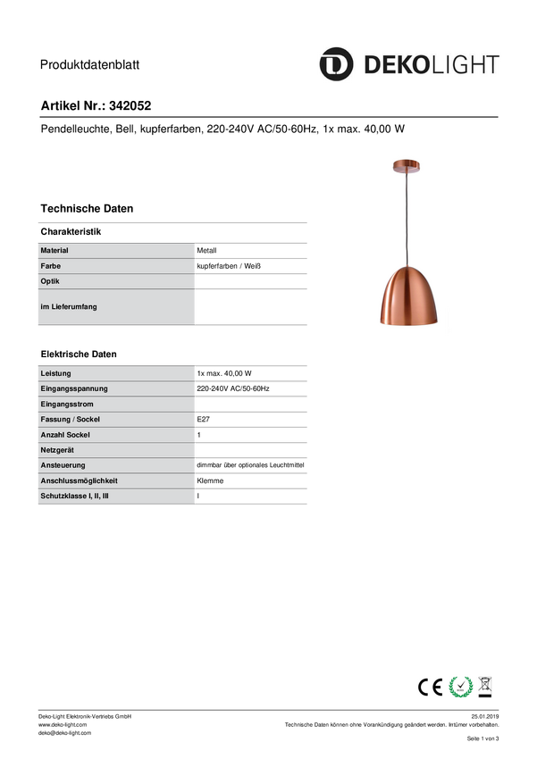 Lampa sufitowa, podwieszana Deko Light Bell 342052 E-27 40 W miedziany
