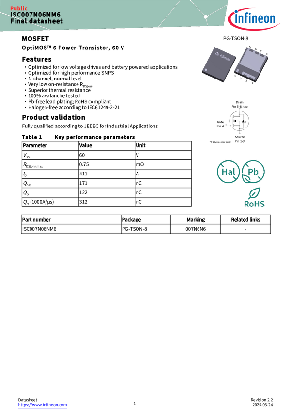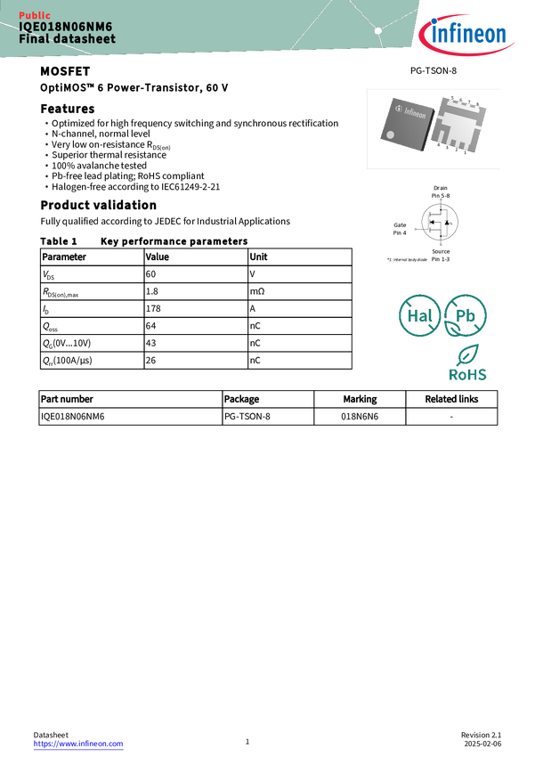 OptiMOS™ 6 n-channel power MOSFET 60 V in SuperSO8 Dual-Side Cooling OptiMOS™ 6 60 V - the latest power MOSFET technology setting the new industry standard for benchmark performance. Compared to its predecessor, OptiMOS™ 5, Infineon's latest wafer technology offers significant performance improvement, including >37% lower RDS(on) and ~32% improved FOMQg x RDS(on) in SuperSO8 DSC. The performance improvements lead to higher system efficiency and power density.
