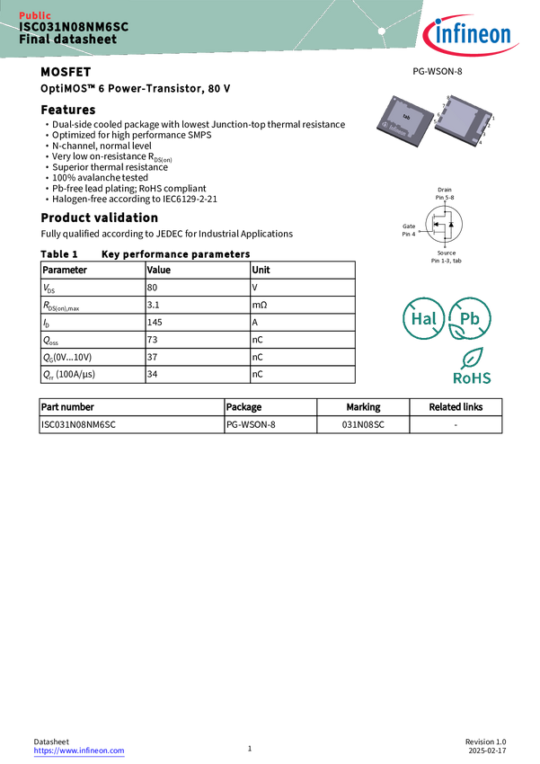 OptiMOS™ 6 n-channel power MOSFET 80 V in PQFN 3.3x3.3 Source Down Center Gate Dual-Side Cooling OptiMOS™ 6 80 V - the latest power MOSFET technology offering industry benchmark performance. Compared to its predecessor, OptiMOS™ 5, Infineon's latest wafer technology offers significant performance improvement resulting to higher system efficiency and power density.