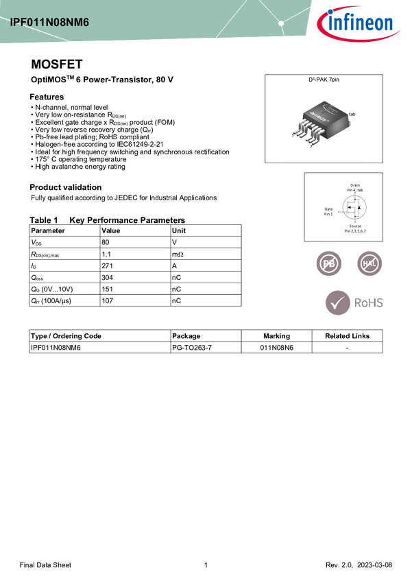 OptiMOS™ 6 n-channel power MOSFET 80 V in D²PAK 7-pin OptiMOS™ 6 80 V - the latest power MOSFET technology offering industry benchmark performance. Compared to its predecessor, OptiMOS™ 5, Infineon's latest wafer technology offers significant performance improvement resulting to higher system efficiency and power density.