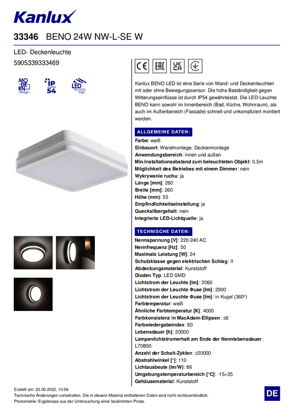 Lampa sufitowa LED, Lampa ścienna LED Kanlux BENO 33346 24 W 2060.00 lm biały