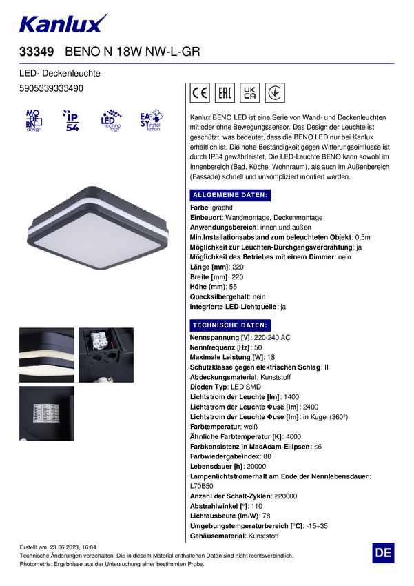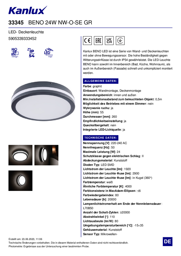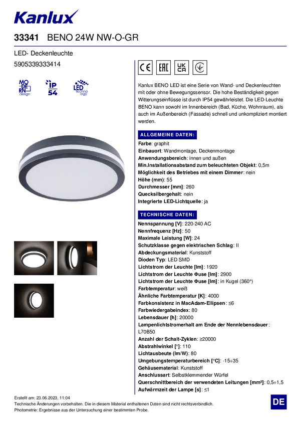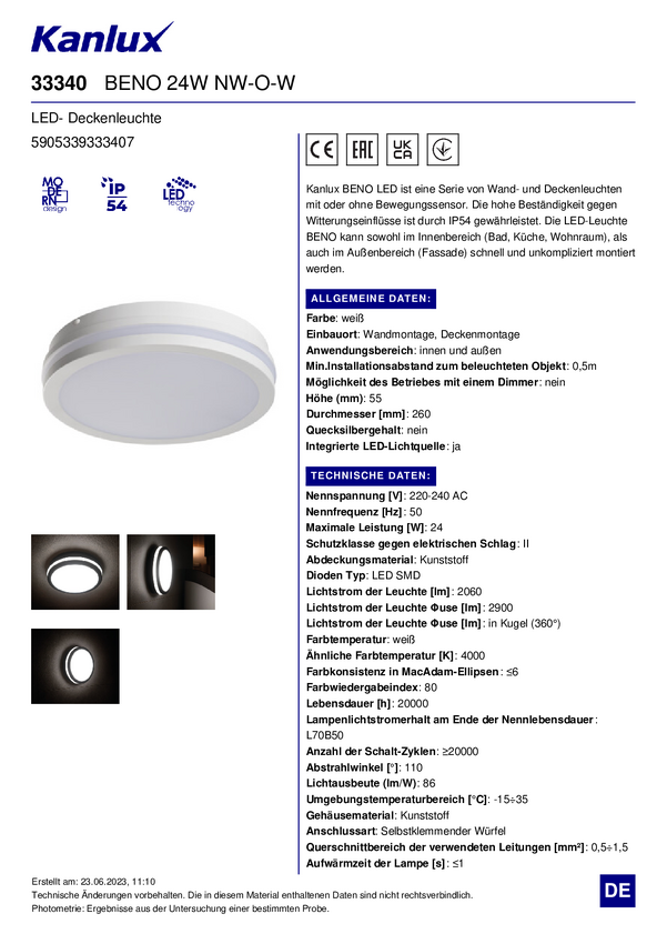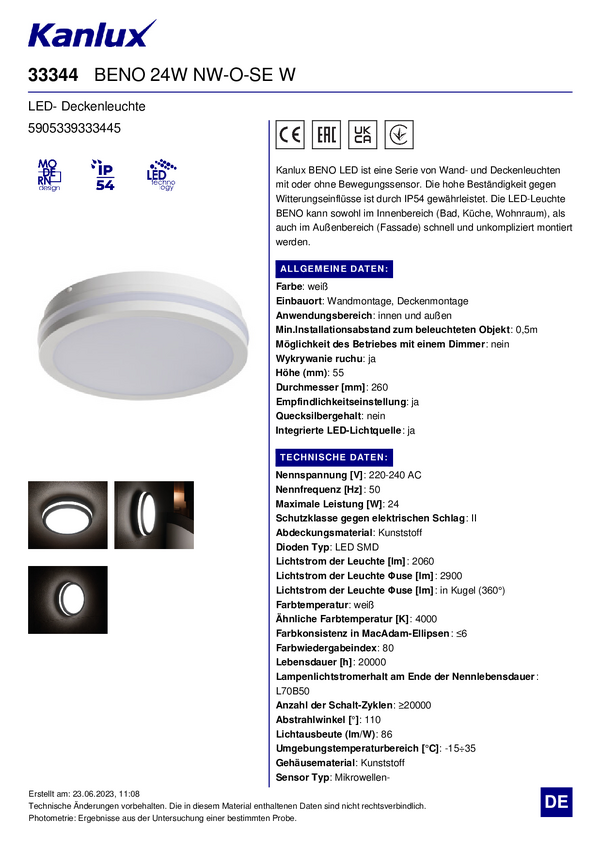 Lampa sufitowa LED, Lampa ścienna LED Kanlux BENO 33340 24 W 2060.00 lm biały