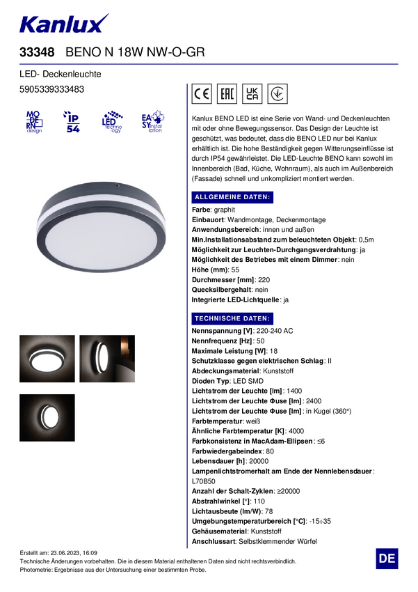 Lampa sufitowa LED, Lampa ścienna LED Kanlux BENO 33348 18 W 1920.00 lm czarny